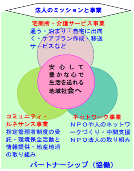 「えぬぴーおー・あい・こむ」のあいは”いわい(IWAI)”の「I」であり、愛情の「I」です。 そして、英語表記を「NPO Iwai Community Support Center」とし、私たちの活動が地域づくりを 支援することを掲げました。 私たちの中核となった事業所が、「宅朗所すりさわ」です。お年寄りの方も、障がいのある方も、 子ども達も 「誰でも使えるサービス」 「誰でも集える家」ということから「宅老所」ではなく、 朗らかな場所 「宅朗所」 としました。 |